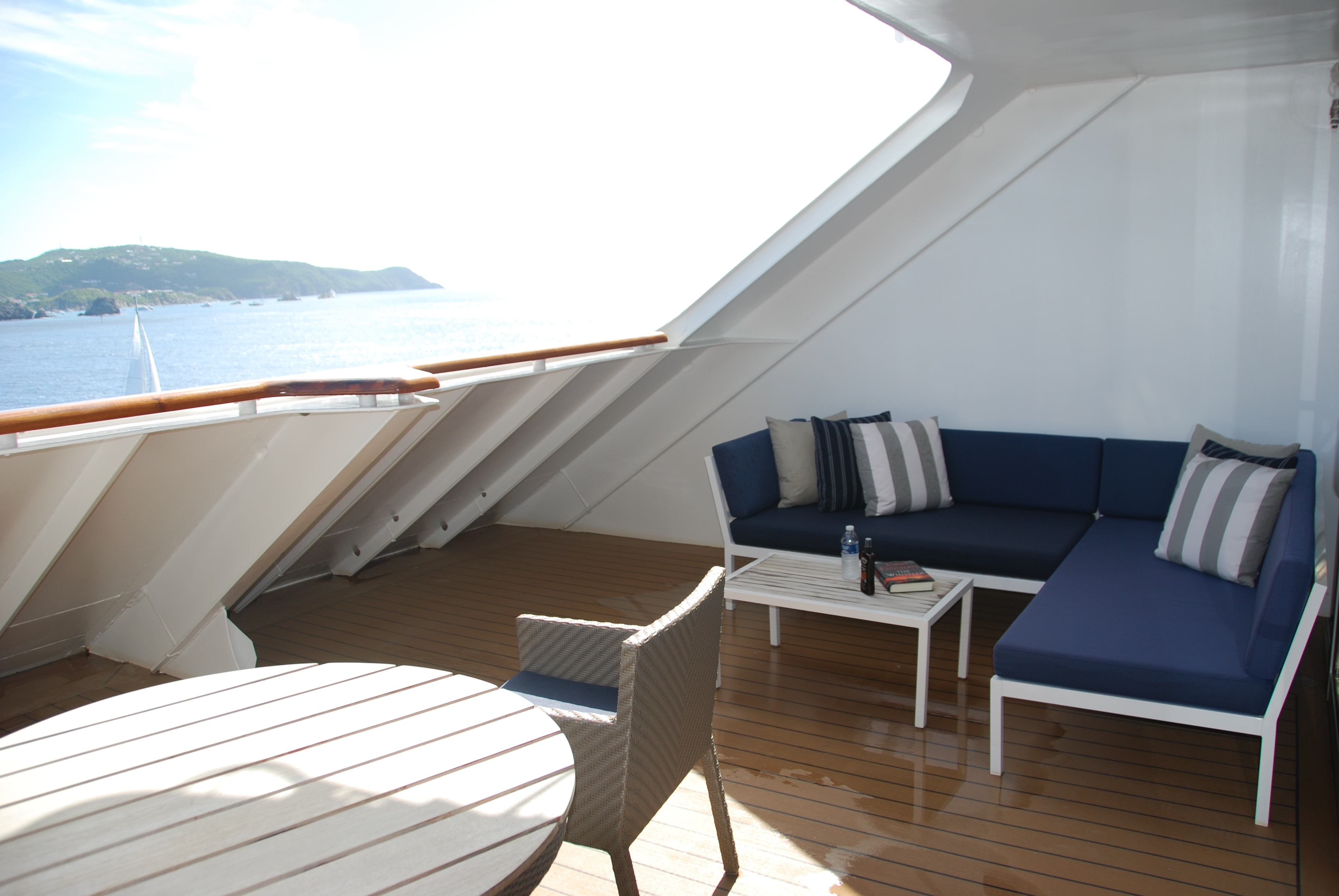 We enjoyed a lovely and spacious accommodation, with an equally spacious balcony. We chose a stateroom in the center of Deck 9 – all the way forward. There were just three staterooms on Deck 9 far forward, and our balcony was totally private, as the balconies for the accommodations on either side of ours opened either to the port side or starboard side. It was a perfect location.