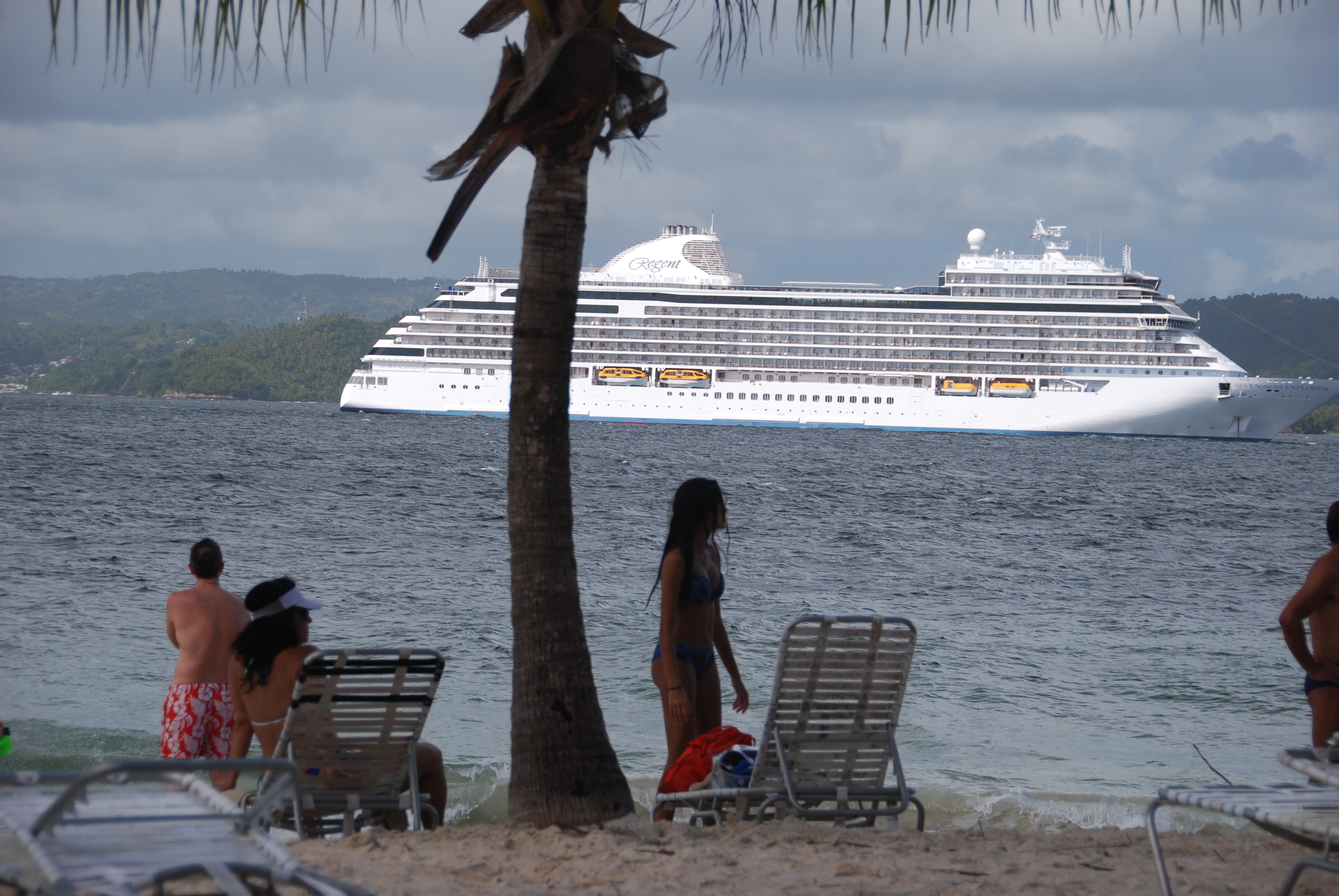 The stunning new 750-guest Seven Seas Explorer – anchored in the harbor of Cayo Levantado, Dominican Republic (Photo by Robyn Bushong.)