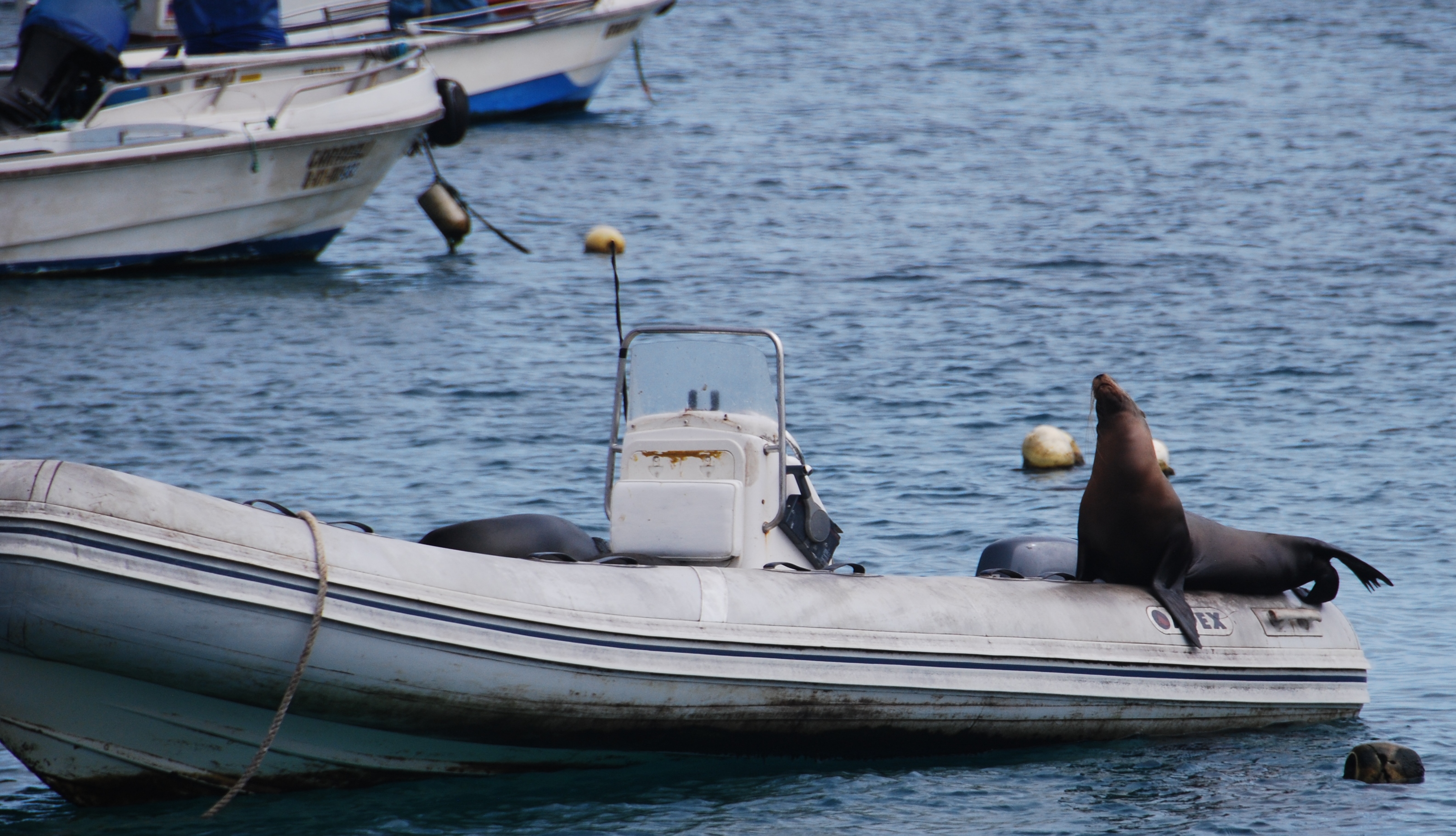 Sea lions resting on the back of motor boats was a common sight in the harbor of Puerto Baquerizo Moreno (Photo by Robyn Bushong.)