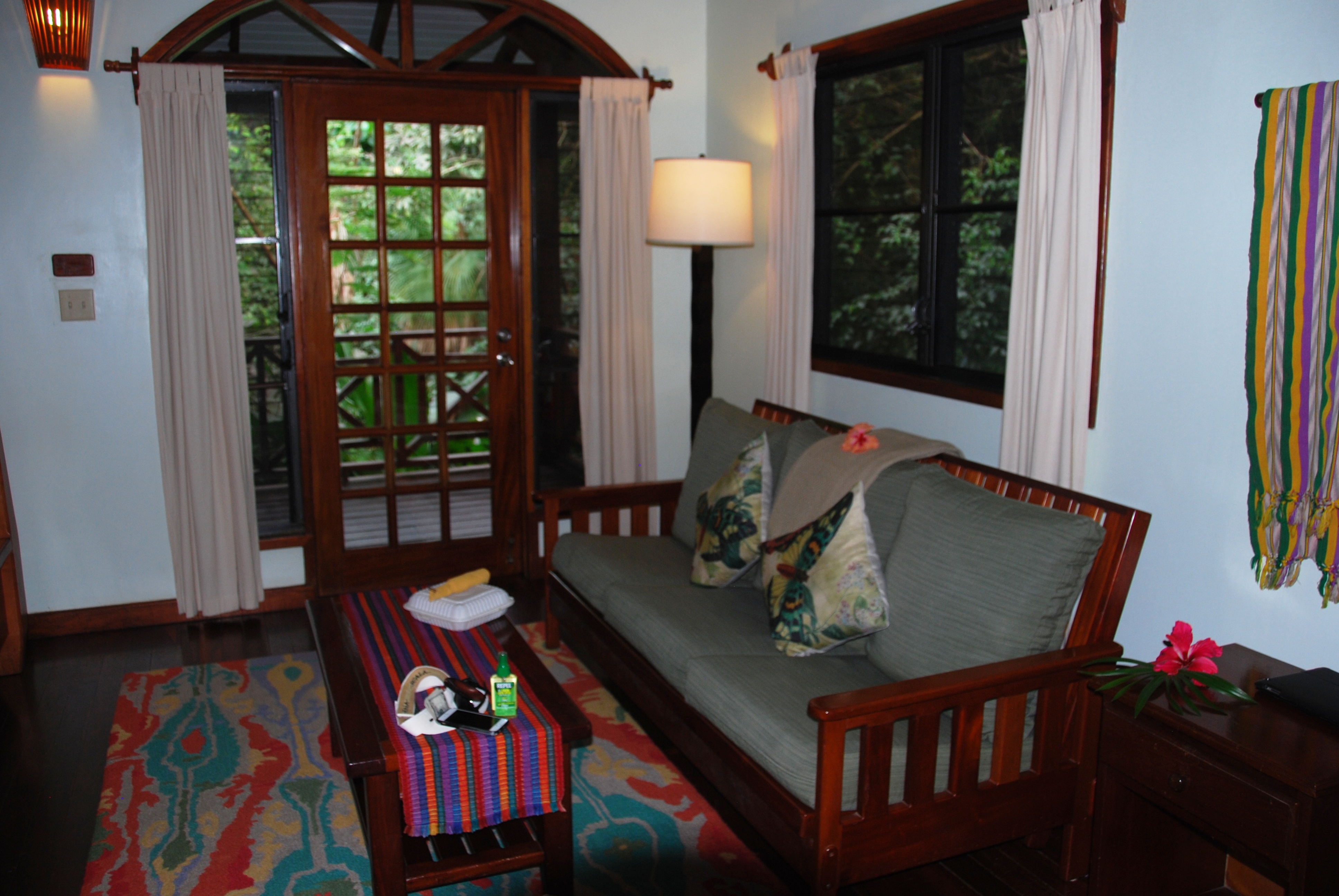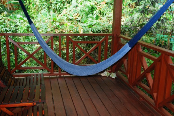 Our tree-house was a large  two-double bed accommodation, with a sitting area, large bathroom and an especially lovely balcony – furnished with a hammock and relaxing chairs – perfect to enjoy your first cup of coffee each morning and listen to the creatures in the trees.  Truly a “tree house” as you were level with the tree tops when sitting on the balcony.   And, it was always very quiet and peaceful throughout the resort grounds.